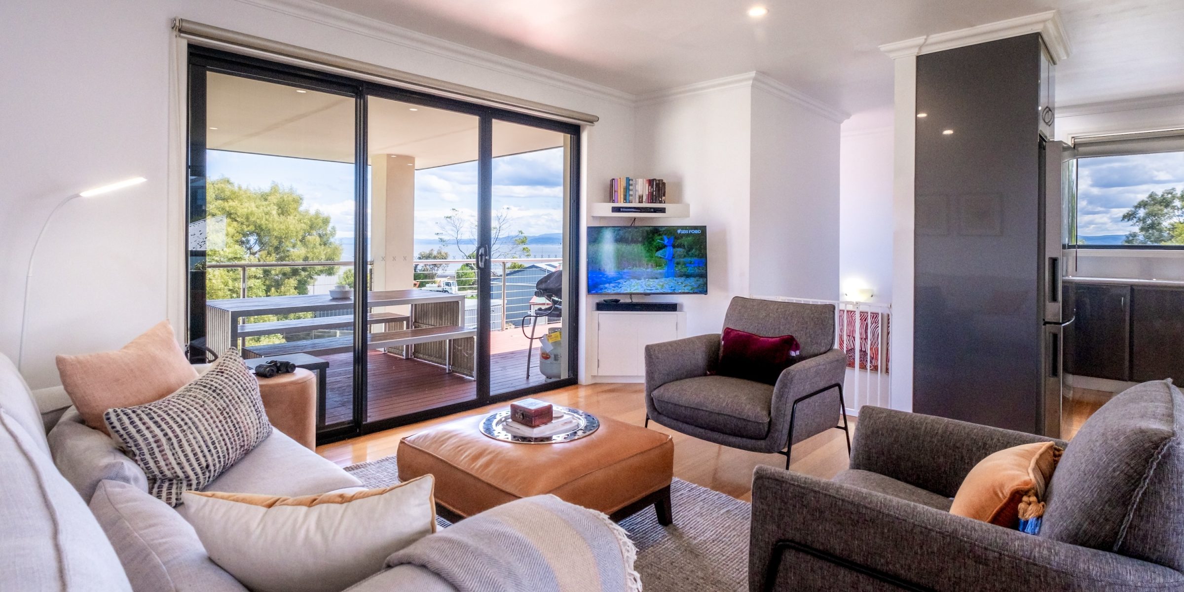 Kelp Freycinet is a beautiful 3 bedroom 2 bathroom property, sunny and elevated with all day sun situated in a quiet and peaceful street. You can sit in the lounge room, kitchen or outside deck with views of the open ocean. The property has many beach walks only a couple of minutes from the doorstep.