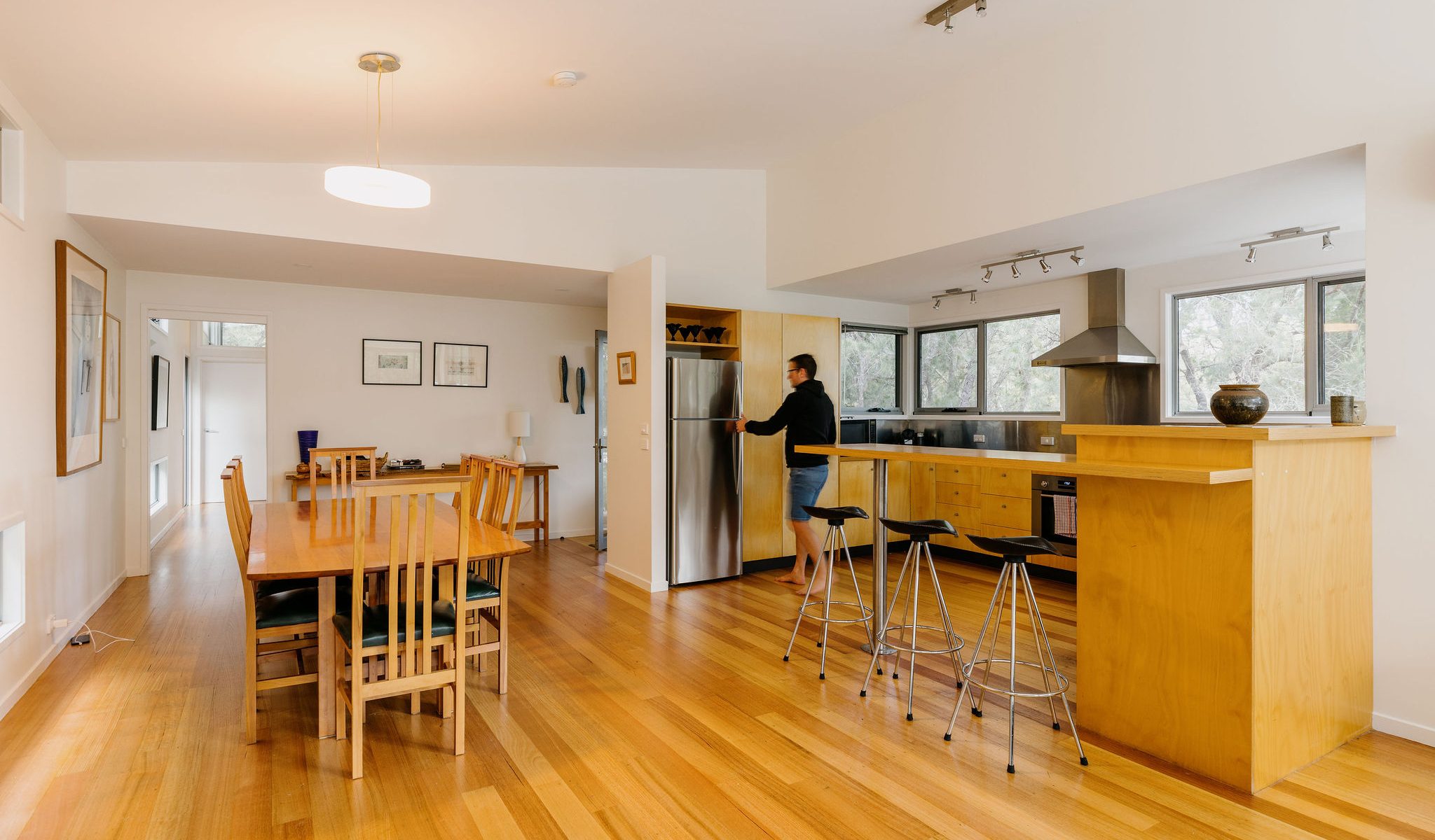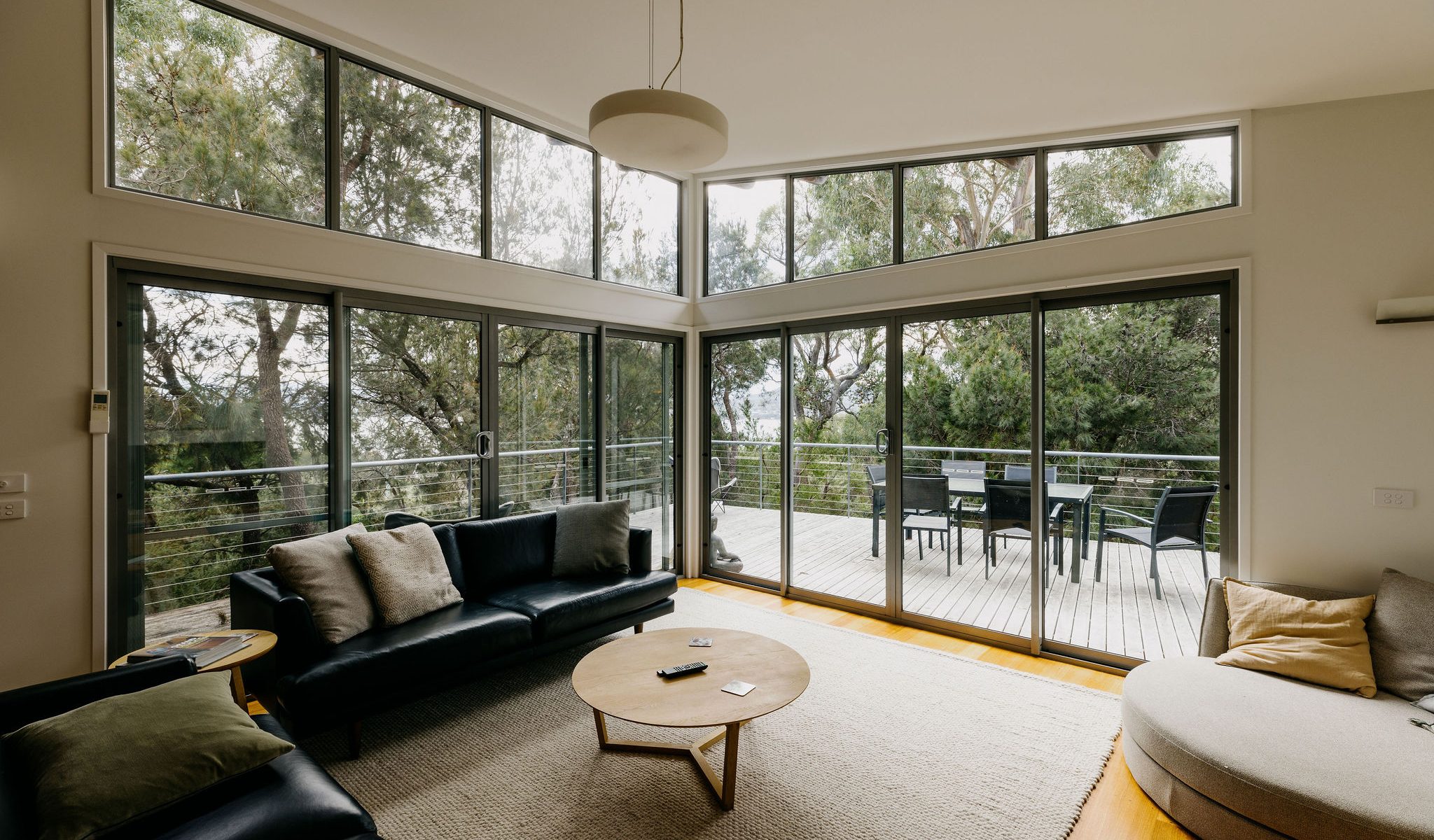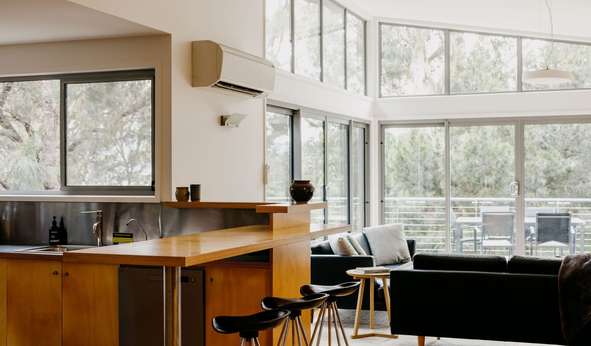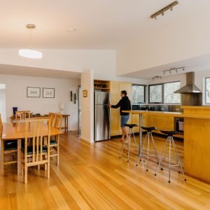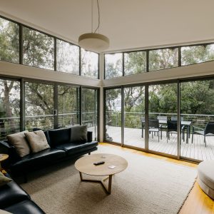 Set against the dramatic backdrop of pink granite mountains, known locally as the Hazards, the house is one of very few with immediate access to Freycinet National Park. The spacious, light-filled interiors are amplified thanks to the oversized double-glazed windows and carefully considered design. With decor featuring the work of renowned Tasmanian furniture maker Rex Heathcote, and a private art collection, the house is registered to accommodate six people and has a wheelchair-friendly ramp for easy access.