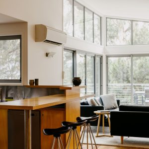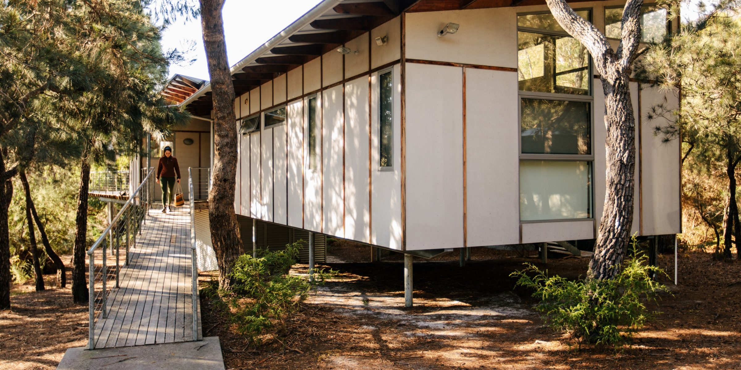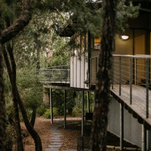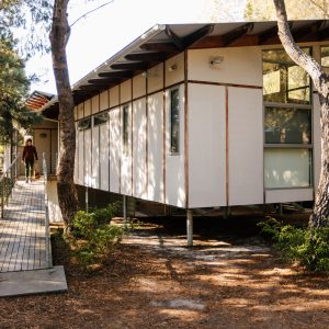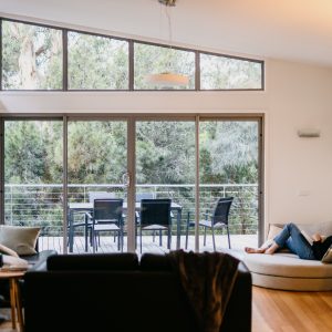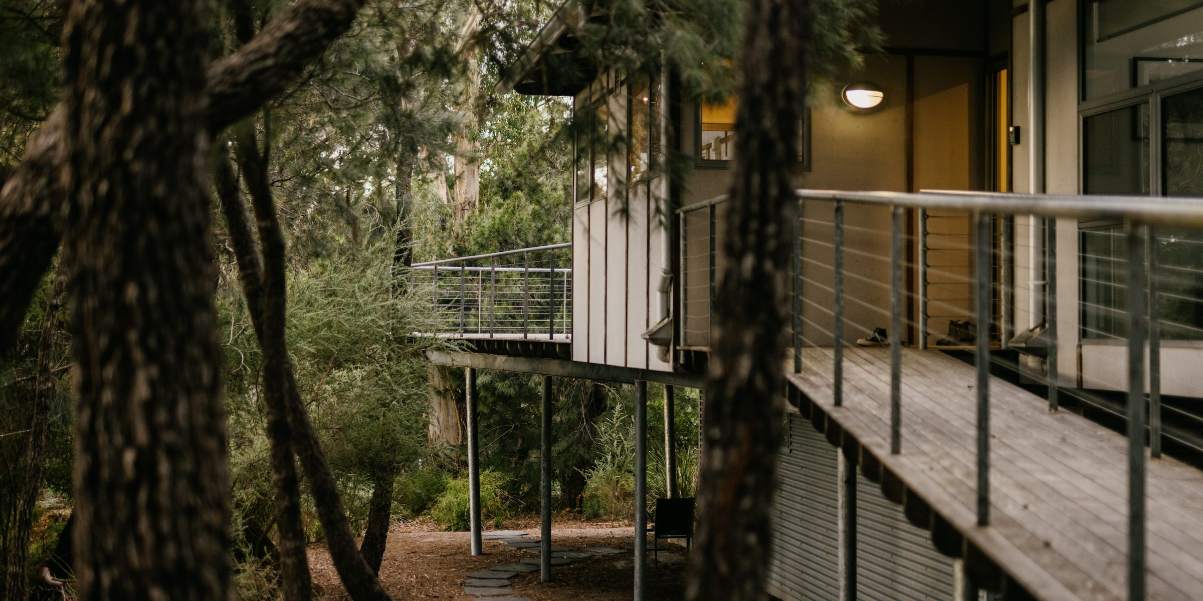 Set against the dramatic backdrop of pink granite mountains, known locally as the Hazards, the house is one of very few with immediate access to Freycinet National Park. The spacious, light-filled interiors are amplified thanks to the oversized double-glazed windows and carefully considered design. With decor featuring the work of renowned Tasmanian furniture maker Rex Heathcote, and a private art collection, the house is registered to accommodate six people and has a wheelchair-friendly ramp for easy access.