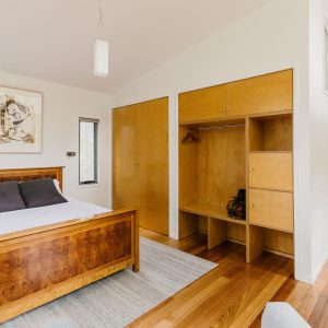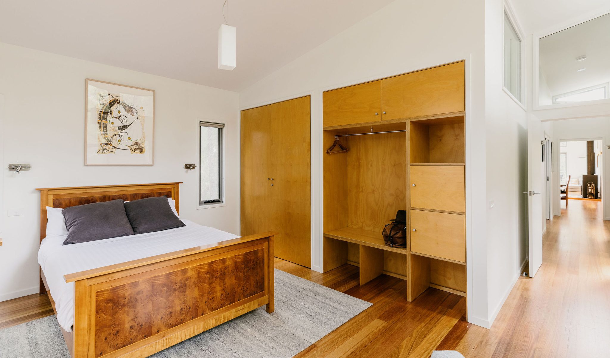 The main living area includes a large open-plan kitchen, dining and living room with a free-standing open fire (May to September only) and three spacious bedrooms, two upstairs and one with an ensuite downstairs. Reverse-cycle air conditioning is available upstairs for your comfort during the warmer summer months. The main living area opens out to a very large north facing deck, made from rare recycled Tasmanian Celery Top Pine, with views to enjoy across Coles Bay. On the main floor, the master bedroom with hand crafted myrtle queen-size bed and study, offer uninterrupted views of Mt. Amos. The second bedroom has two single beds (can be converted into a king bed) with bush and water views, and shares a bathroom featuring a luxurious Philippe Starck bath. There are laundry facilities which include a front loading washing machine.