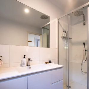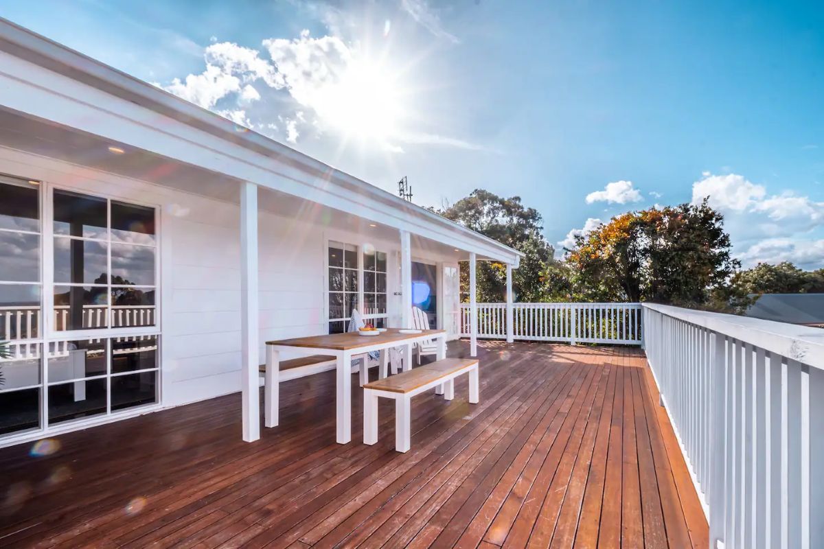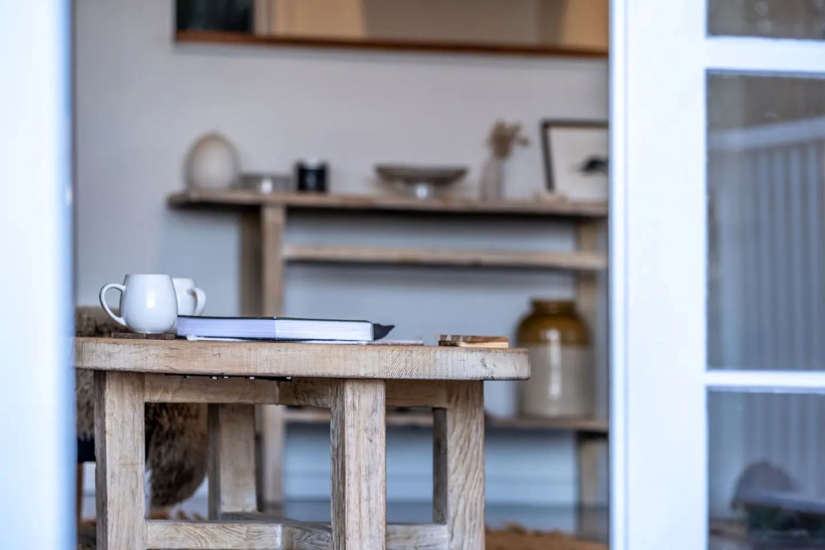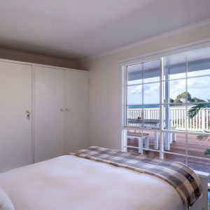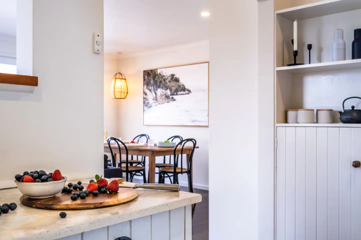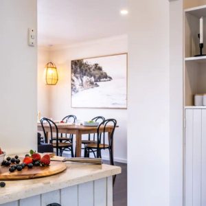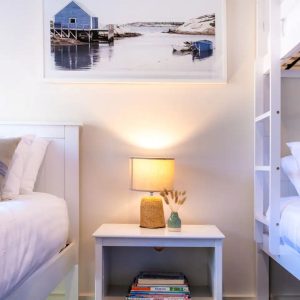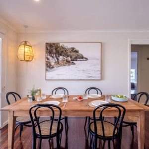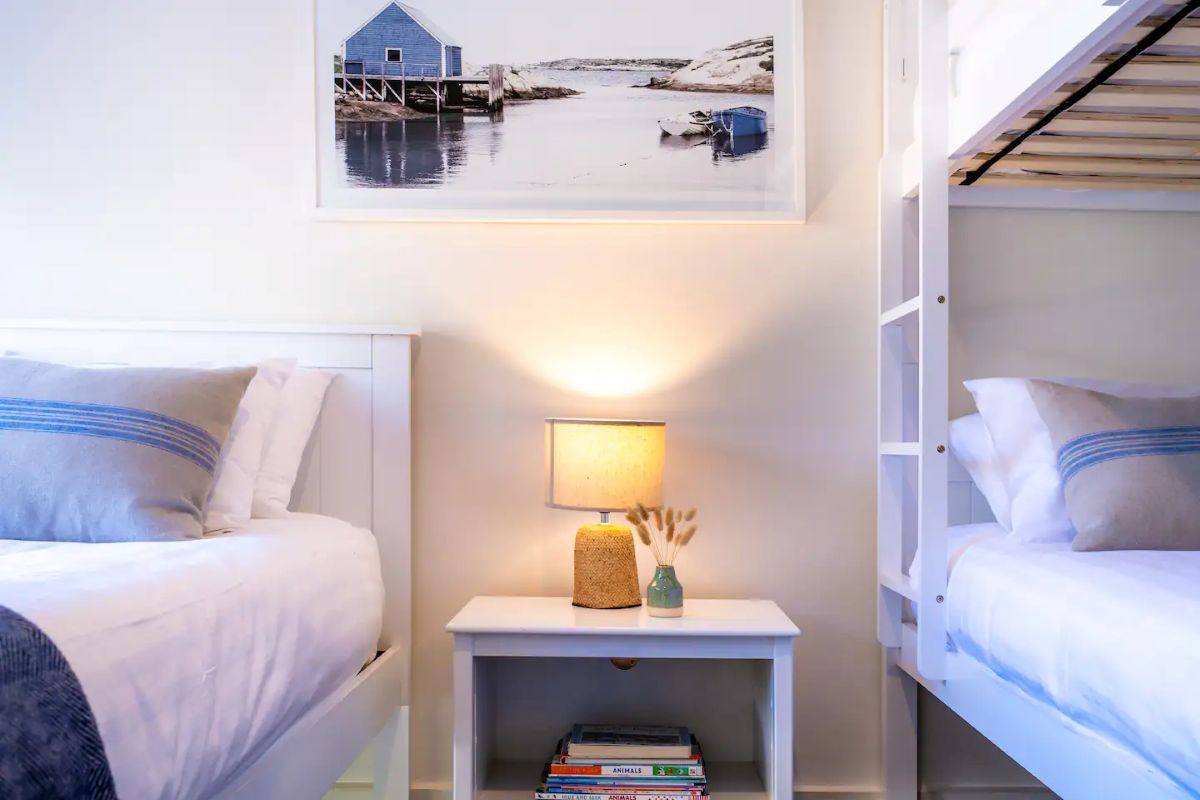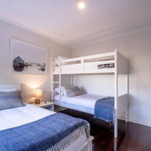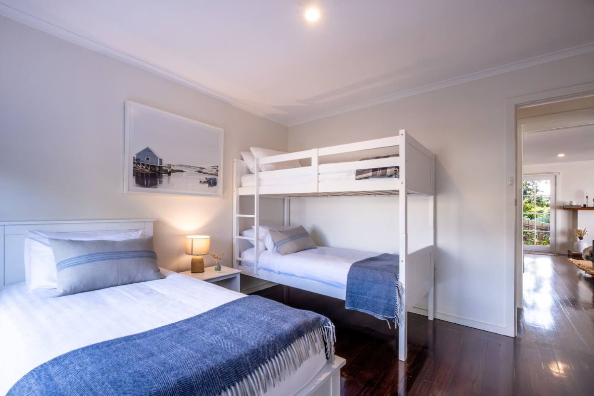 I relax at the dining table with a wine and produce from the local vineyards and seafood restaurants. Just off the main lounge room you will find the master bedroom that is flooded with morning light at sunrise and also this space overlooks Waubs Bay. Down the hall you will find a single bed and a double bunk for those larger family or friend group getaways.