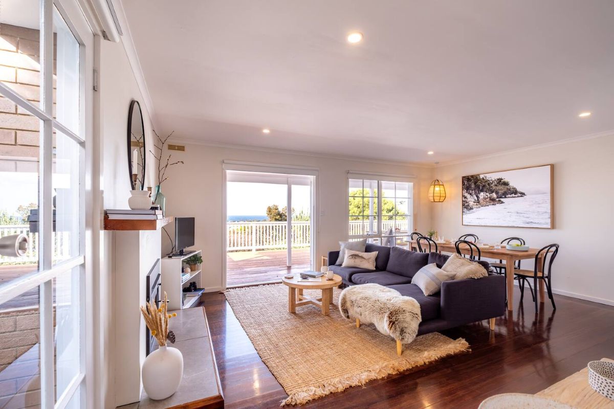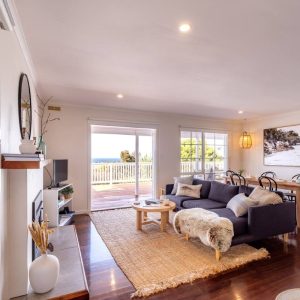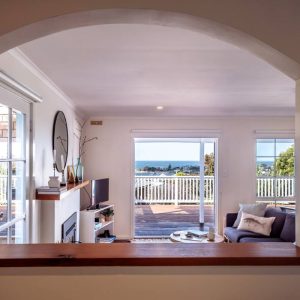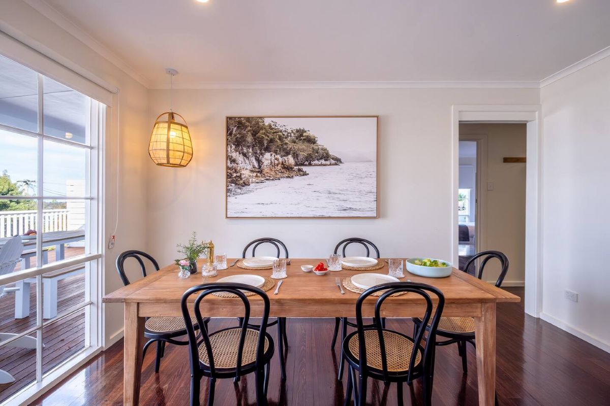 Book NowUpon entering The Shack you will notice the attention to detail with the styling and how beautifully cosy the open plan living dining space is. The lounge room flows out onto the sun drenched deck through the bifold doors where you can enjoy cocktails and Bicheno’s famous local produce and wine. The large couch surrounds the living space which has gorgeous views to the famous Waubs beach.
