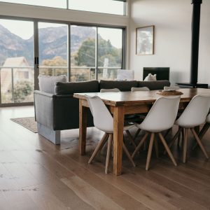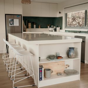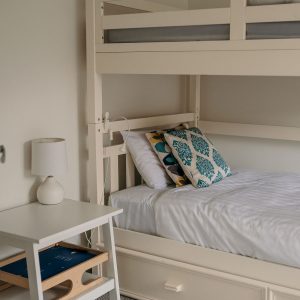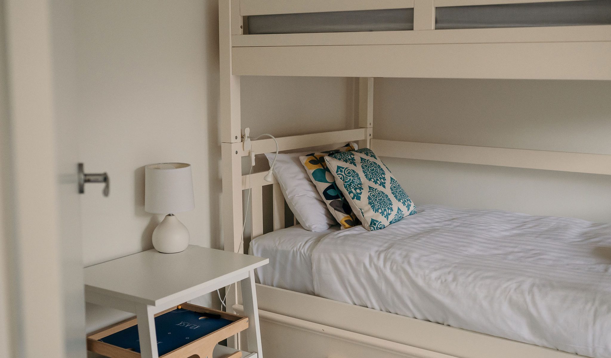 The spacious open-plan kitchen/living room is drenched in sun all day and has a large, well-stocked kitchen to cater for keen cooks. Appliances include a Nespresso machine, pizza cooker, bread maker, and sandwich press. The wood fire makes this a sought-after house year round. There are three bedrooms upstairs, two with stunning views, the third with king-single bunks.