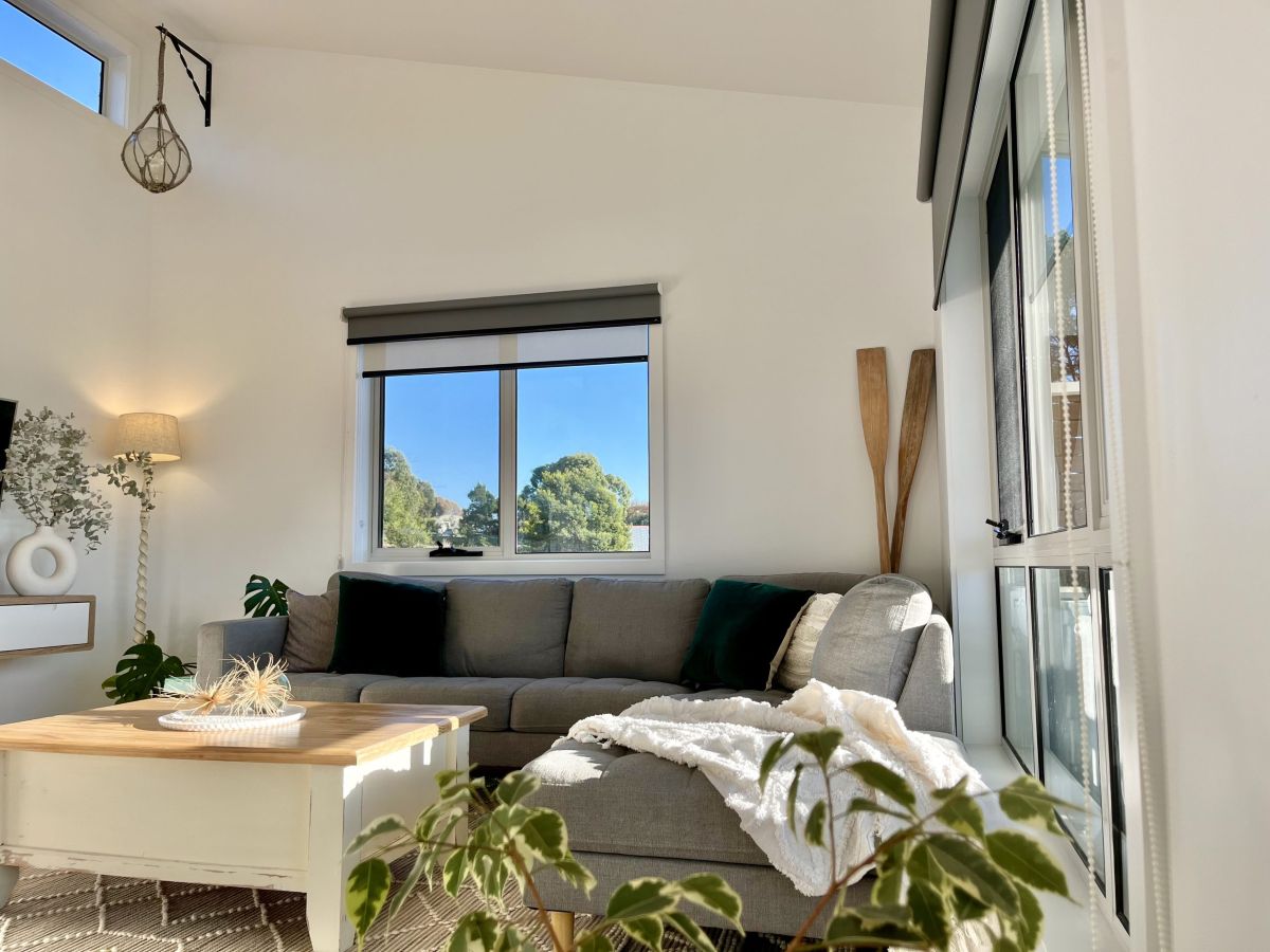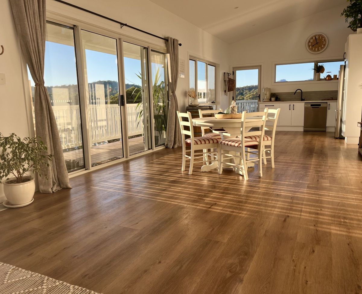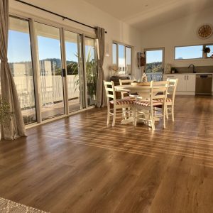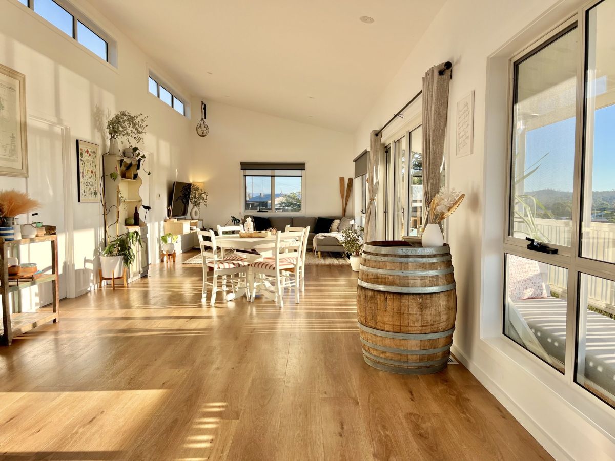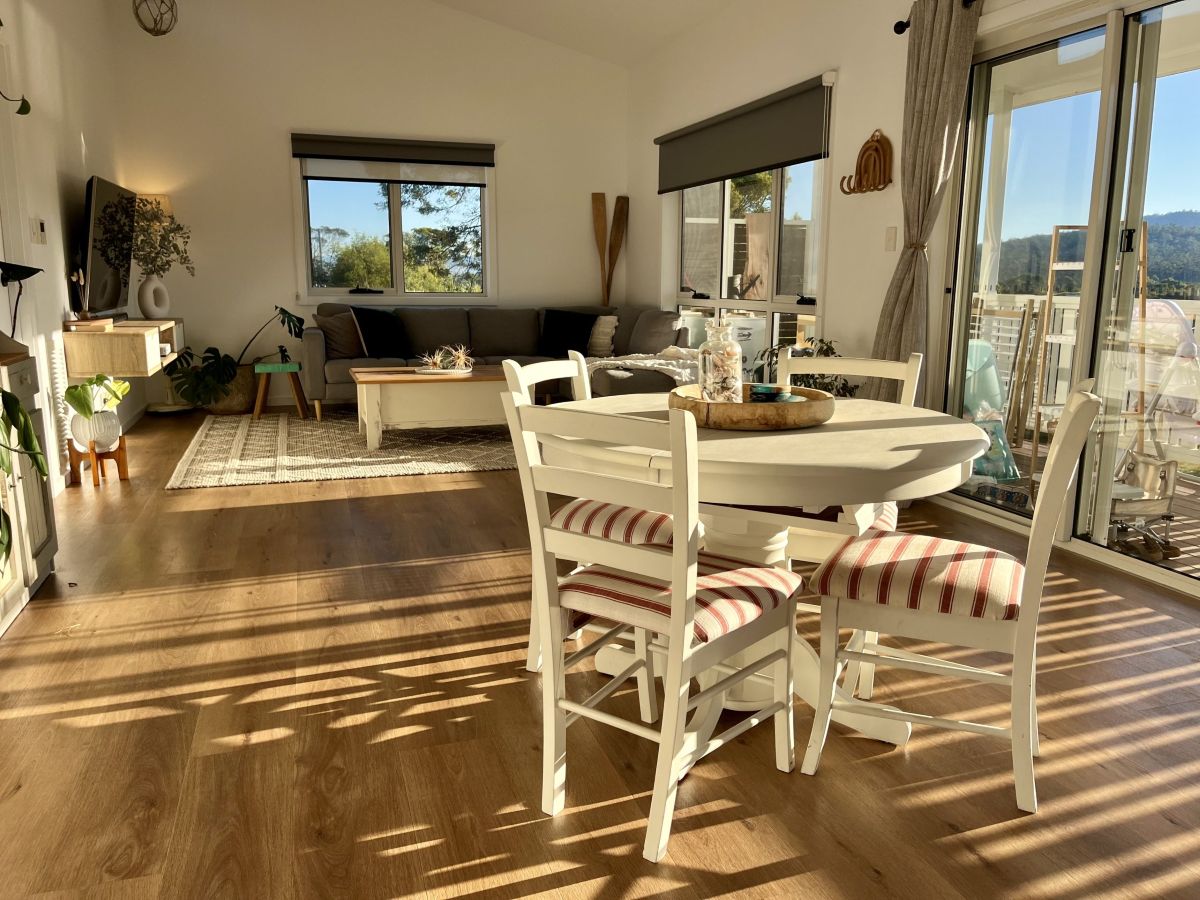 Enjoy stunning panoramic hilltop views from the Hazard mountains over the green coastal bush land and in toward the Swanwick river mouth with all-day sunshine beaming through the large windows and bouncing off the polished wooden floors and clean white space.