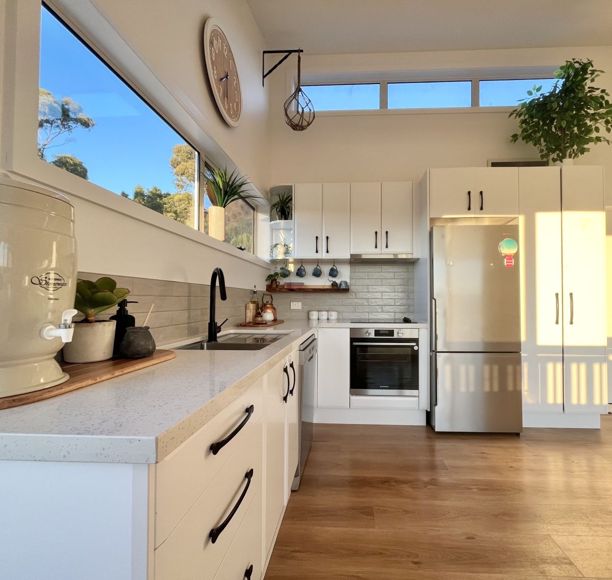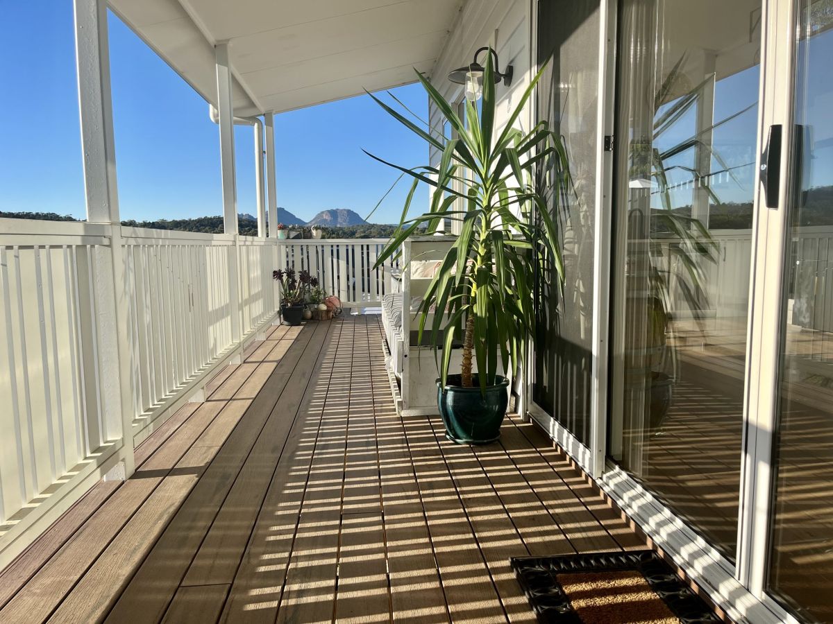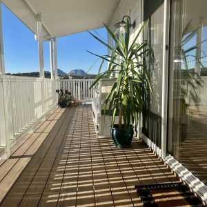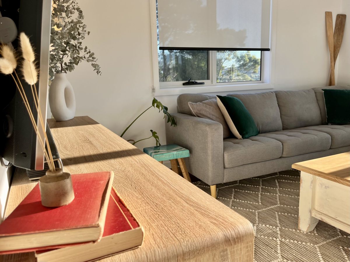 Enjoy stunning panoramic hilltop views from the Hazard mountains over the green coastal bush land and in toward the Swanwick river mouth with all-day sunshine beaming through the large windows and bouncing off the polished wooden floors and clean white space.